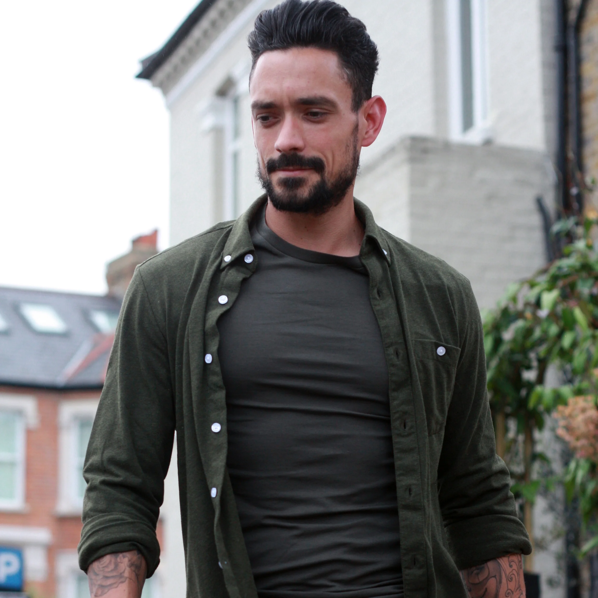 In the above look I'm wearing khaki biker style skinny trousers available for only £30 at ASOS. Converse Chuck Taylor All-Star hi top trainers in a camouflage print available via Foot Locker at £59.99. On the top halve I have tucked in a plain white tee and black short sleeved check shirt again from ASOS for only £25.