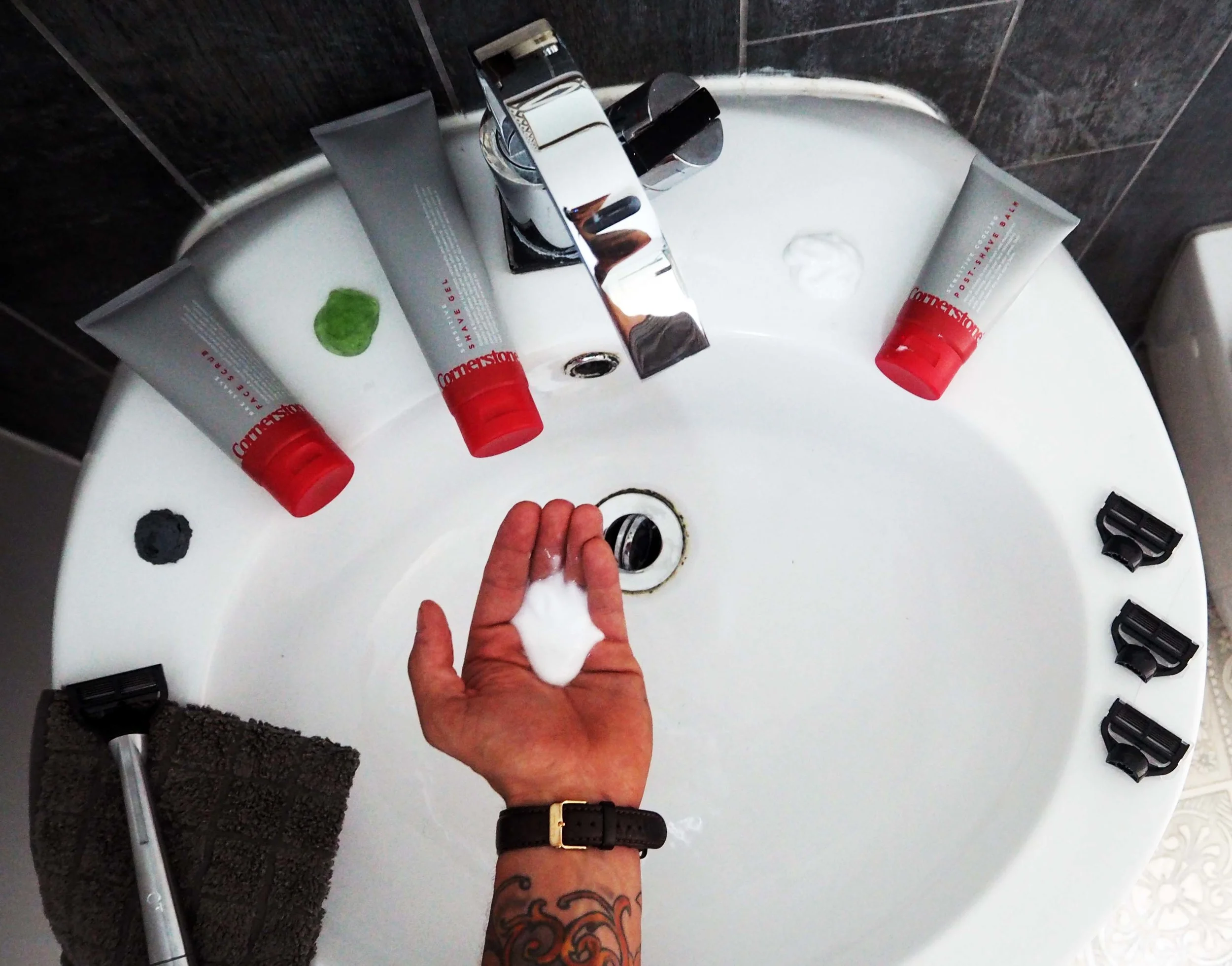 I have very thick, curly, course stubble (give or take a couple of bald patches!) and often get ingrown hairs, so when I shave it is crucial to always start with the Cornerstone pre-shave face scrub which is a thick cream with cedarwood & volcanic sand to help prevent nicks, cuts and shaving bumps. The grains, when massaged into your beard/stubble helps release ingrowing hairs, unblock pores and lifts away dead skin cells.